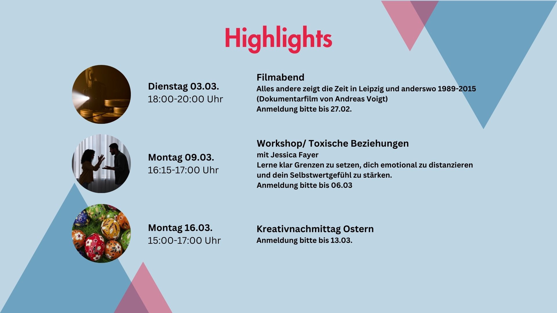 Zum Programm der Begegnungsstätte gehören zahlreiche spannende Veranstaltungen. So steht z. B. monatlich ein Kreativnachmittag auf dem Plan, locken interessante Dia-Vorträge in entfernte Gegenden unseres Erdballes, geht es bei der Sportgymnastik überflüssigen Pfunden an den Kragen und die Freunde von Briefmarken finden hier ihren Platz, um eifrig zu tauschen.